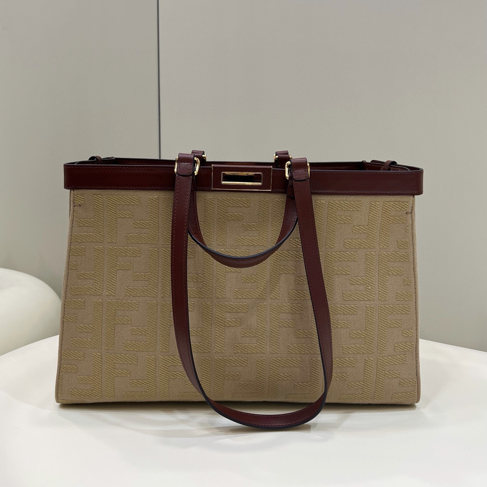 X-Tote中號手袋,帆布材質,飾有同色系FF浮凸圖案刺繡。綴有深棕色皮革飾邊,飾有經典扭鎖。