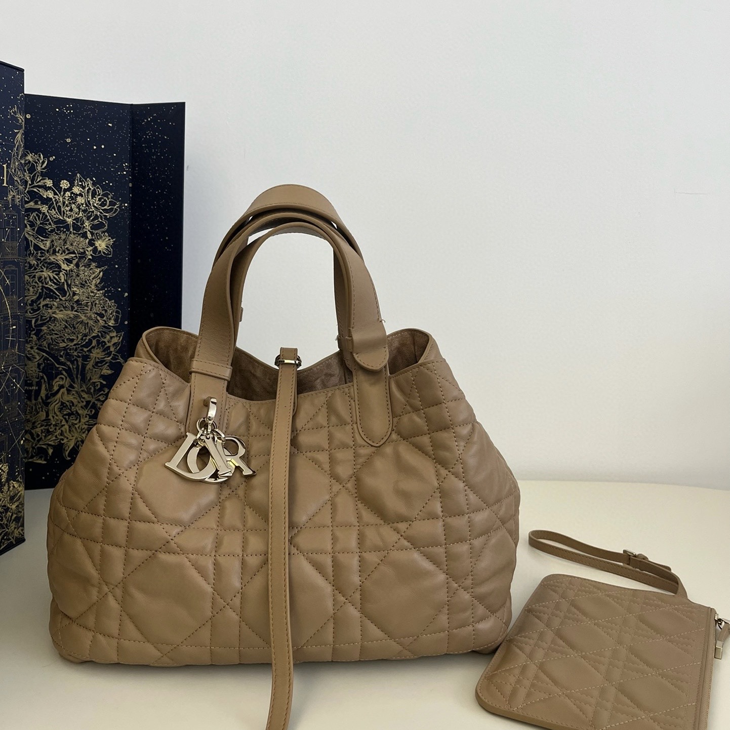 這款 Dior Toujours 手袋休閑實用,別具一格。采用胭脂米色牛皮革精心製作,飾以超大藤格紋緝面線,寬敞的內部隔層搭配小袋,可整齊收納各種日常用品。設有纖細皮革系帶開合,可安全收納各種物品,另有 CD Lock 字母 D 旋鈕式扣環,可調節兩側,提升格調。中號款式,皮革手柄帶有可調節細節,可手提或肩背。