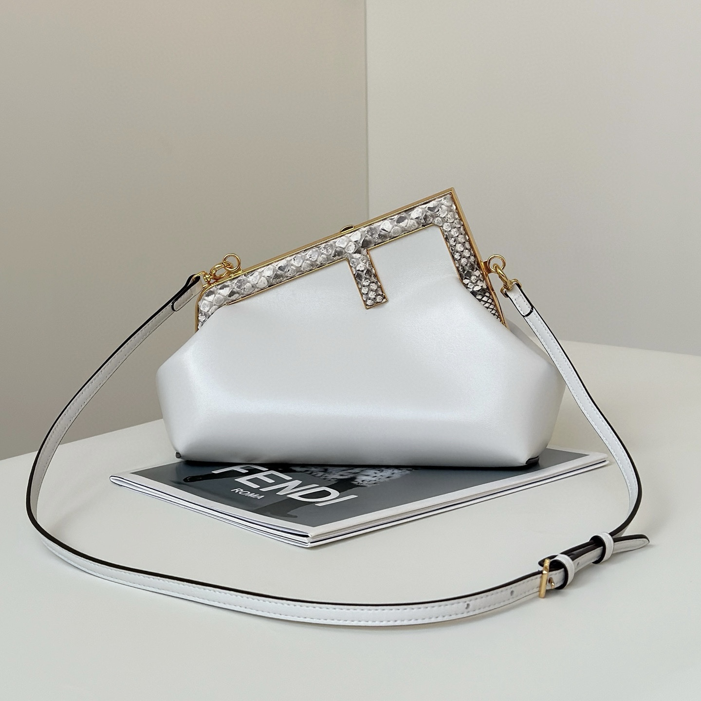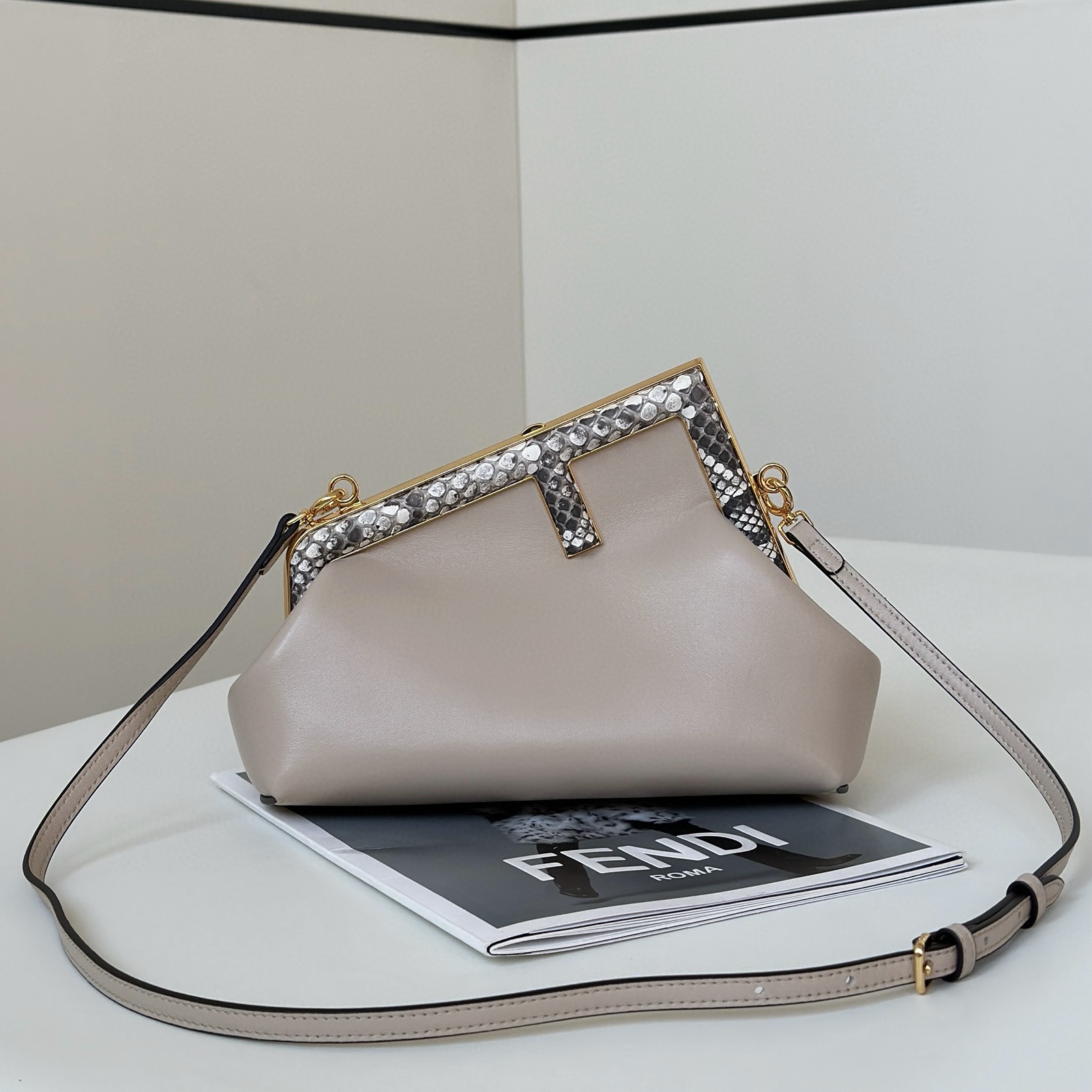 Fendi First小號手袋,納帕軟皮革材質,同色系蟒蛇皮上固定有超大F金屬搭扣。