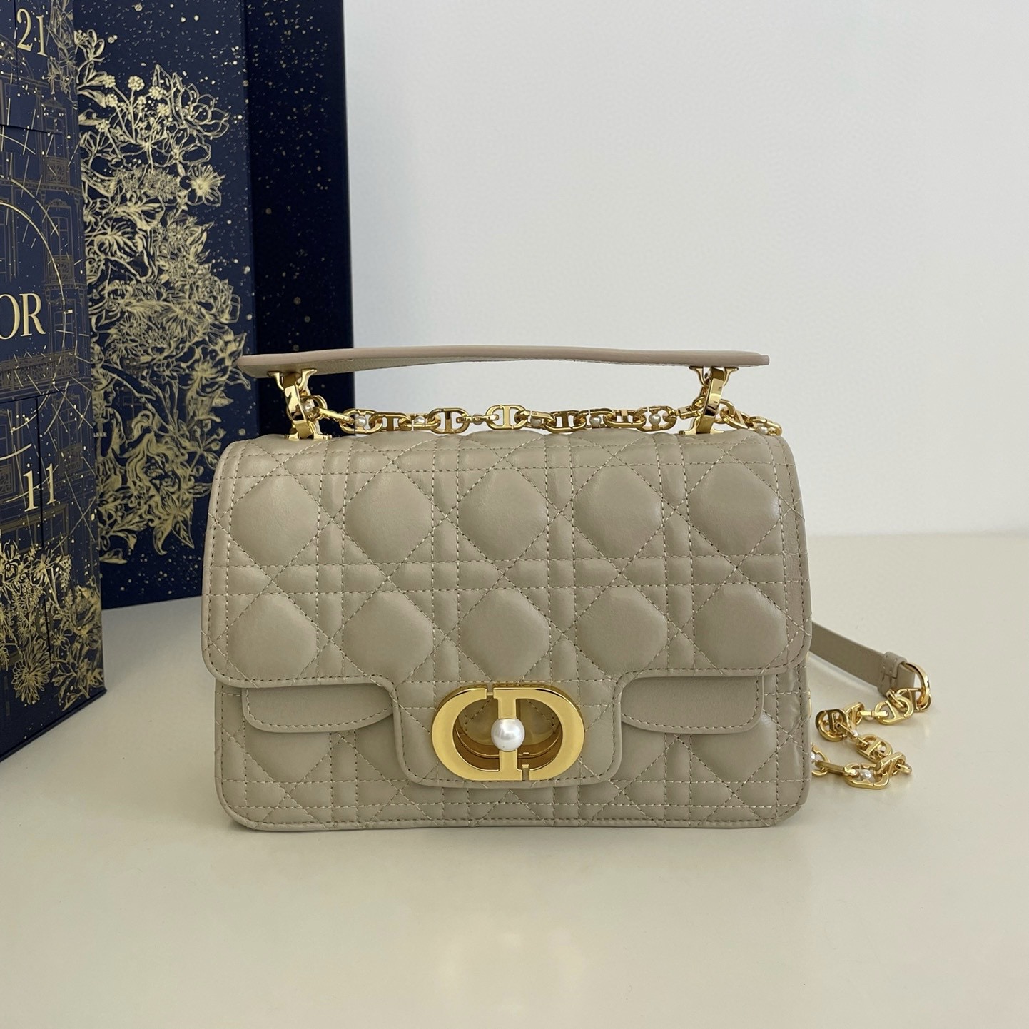 這款 Dior Jolie 手提包是二零二四春夏成衣系列新品,兼具優雅氣質與實用功能。采用奶白色牛皮革精心製作,飾以藤格紋緝面線,雙重翻蓋飾以 CD 標誌提升格調,點綴以白色樹脂珠飾,三隔層和拉鏈口袋可收納各種日常用品,可與日常或晚裝造型搭配。迷你款式,搭配可拆卸手柄與可拆卸鏈條肩帶,肩帶由皮革帶和 CD 標誌鏈環組成,飾以白色樹脂珠飾,可舒適手提、肩背或斜挎。