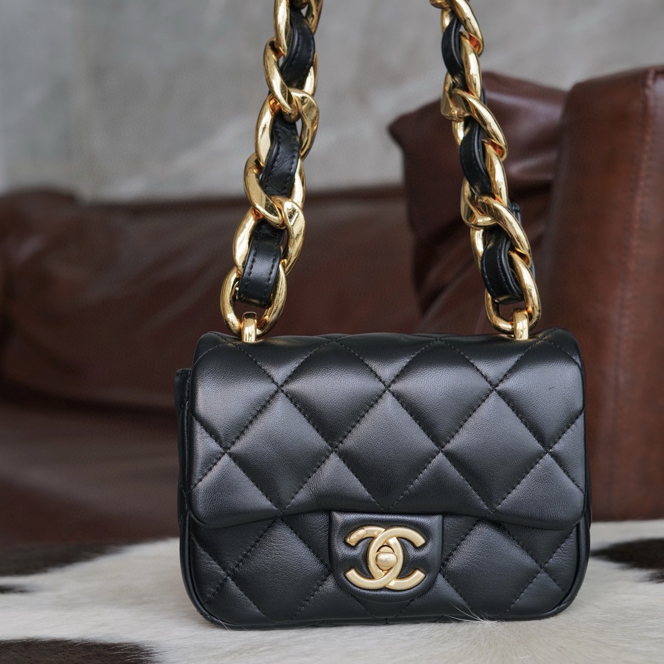 𝗖𝗵𝗮𝗻𝗲𝗹 𝟮𝟮𝘀𝘀春夏走秀款粗鏈條腋下包,意大利🇮🇹《方框》原產小羊皮🐑、柔軟而光滑,毛孔細膩,黑金配色就是永遠的神,超經典,復古又百搭,可手拎可單肩,真的太洋翻了