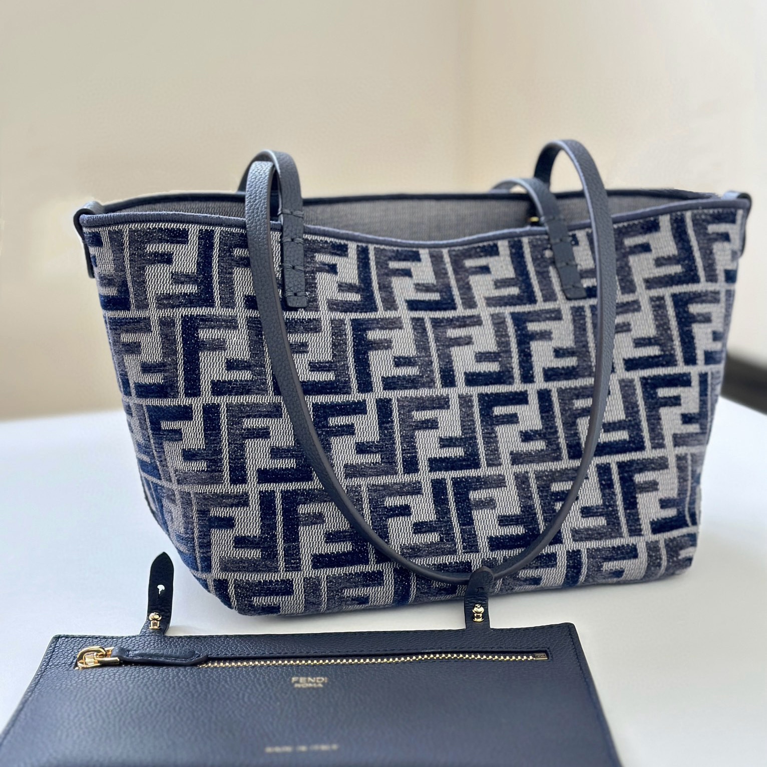 標誌性深藍色FF雪尼爾材質,背攜時可看見底部的復古金色飾面金屬FENDI字樣。