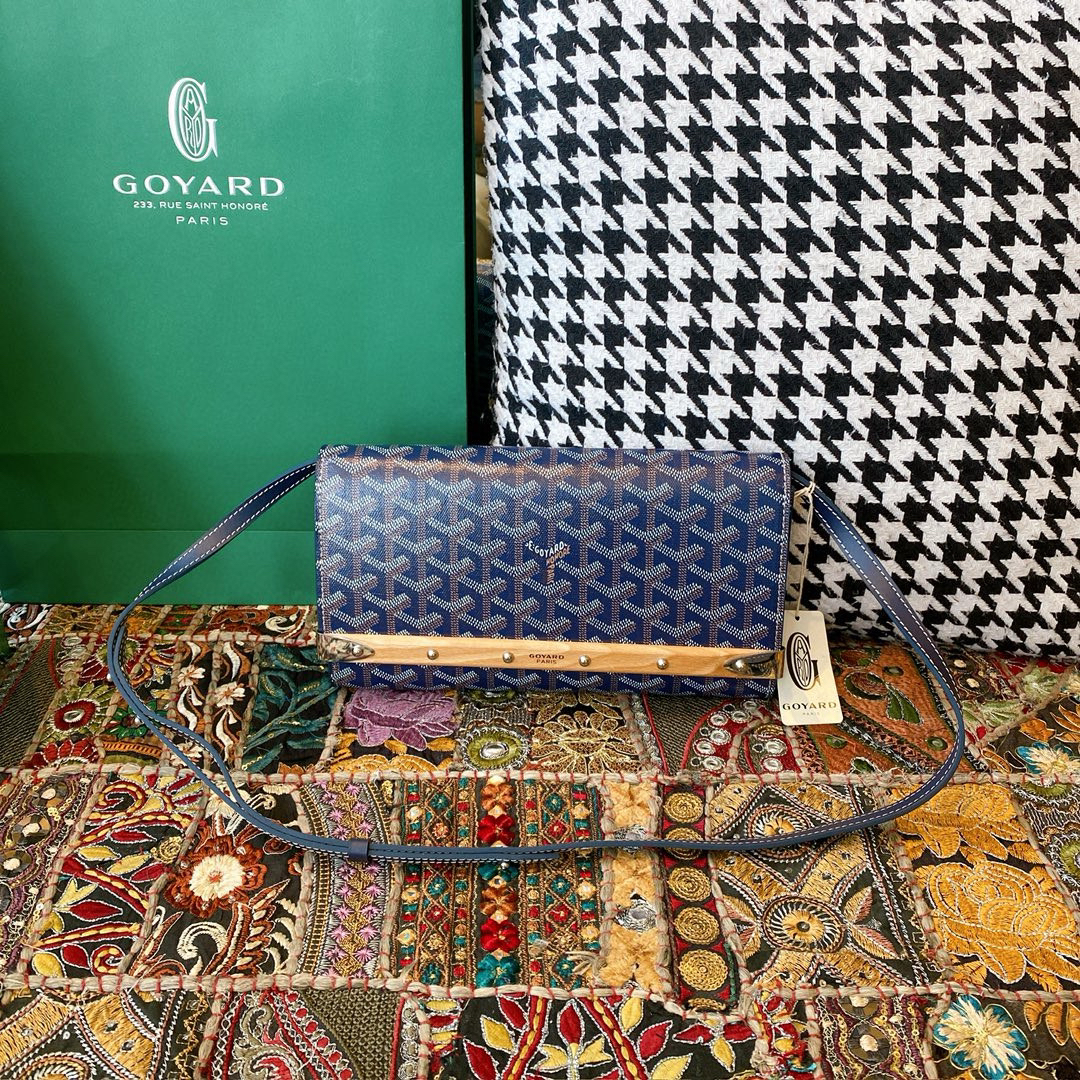 Monte-Carlo迷你手拿包再次詮釋了一些Goyard標誌性行李箱的特征,例如木條、角托和行李箱的鉚釘。它被設計為一款手拿包,可以通過兩個皮革環而佩在腰帶上,還可以搭配一條小號肩帶斜跨。