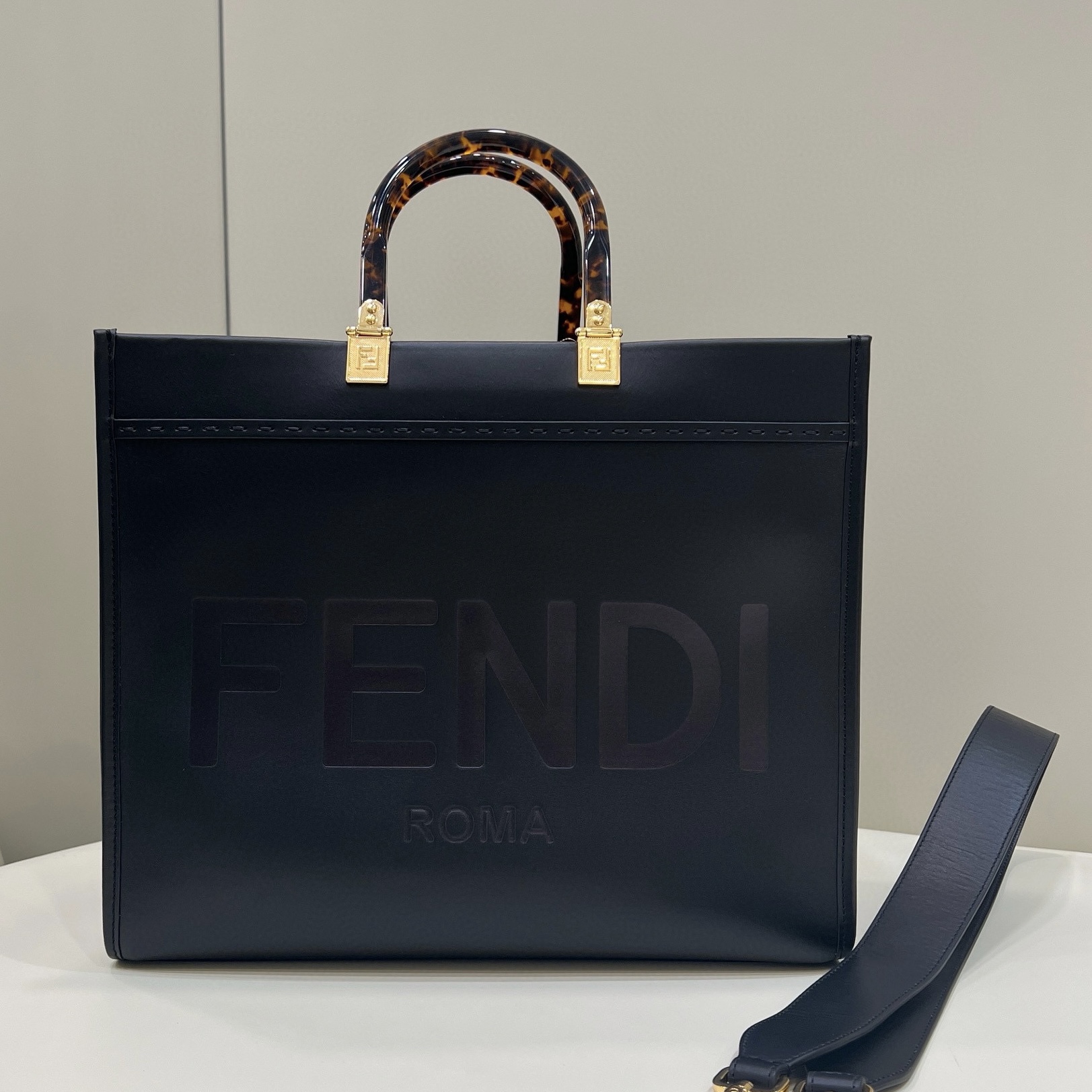 FENDI芬迪女包托特包官方網站 黑色 牛皮革 Sunshine中號手提包購物包
