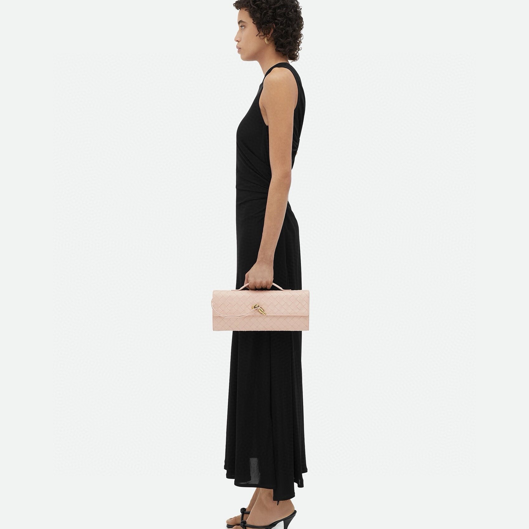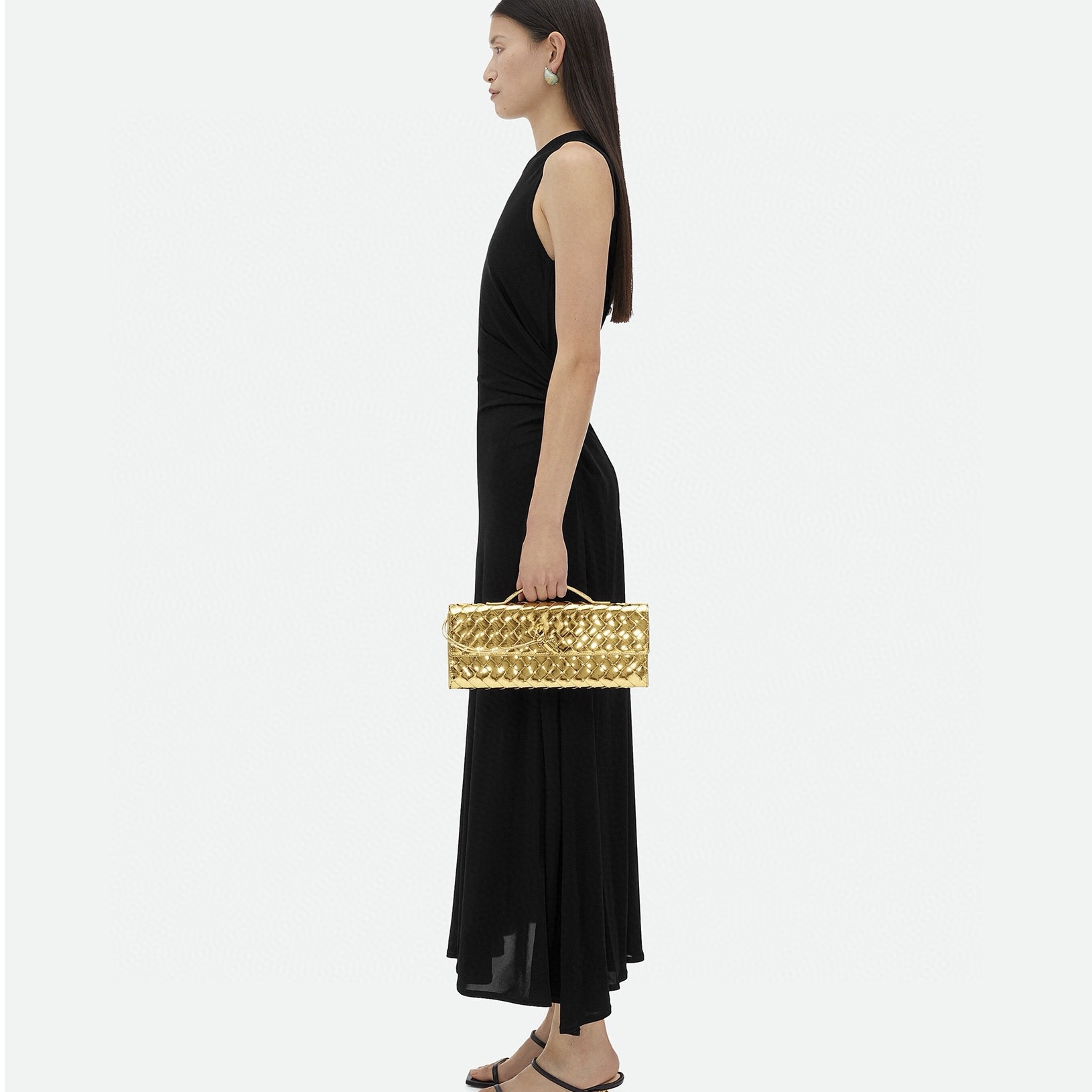 • Intrecciato編織皮革手拿包,配有提手,金屬質感紐結開合