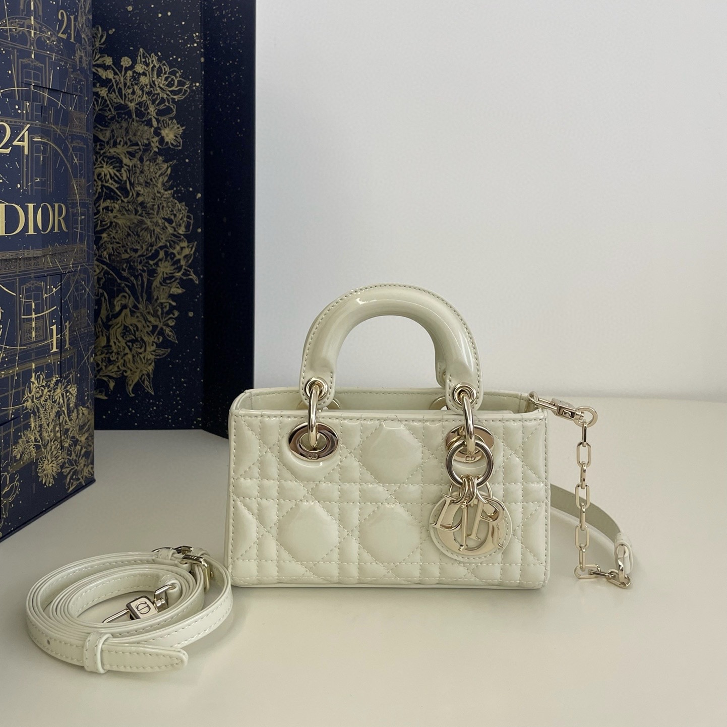 這款 Lady D-Joy 超迷你手袋凸顯 Lady Dior 系列的簡約美學,集中體現了 Dior 對優雅和美麗的深刻洞見。采用黑色漆皮牛皮革精心製作,時髦典雅的設計經久不衰。飾以藤格紋緝面線,點綴以淺金色飾面金屬 D.I.O.R. 吊飾提升格調。搭配可拆卸的鏈條肩帶和可調節、可拆卸的皮革肩帶,可手提、肩背或斜挎,是日常或晚裝造型的理想之選。