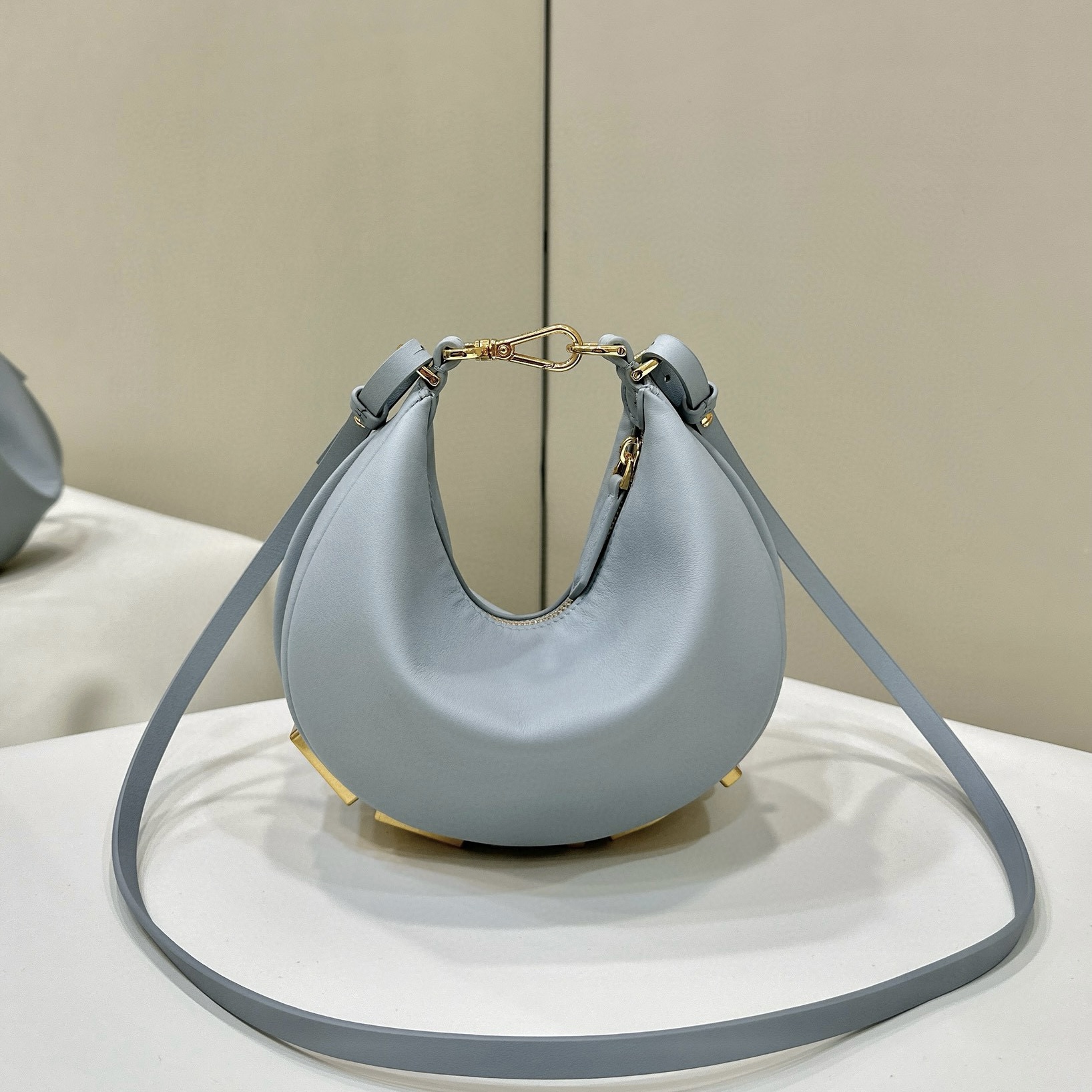 迷你新月包,柔軟白色皮革材質,飾有復古金色金屬FENDI字樣。