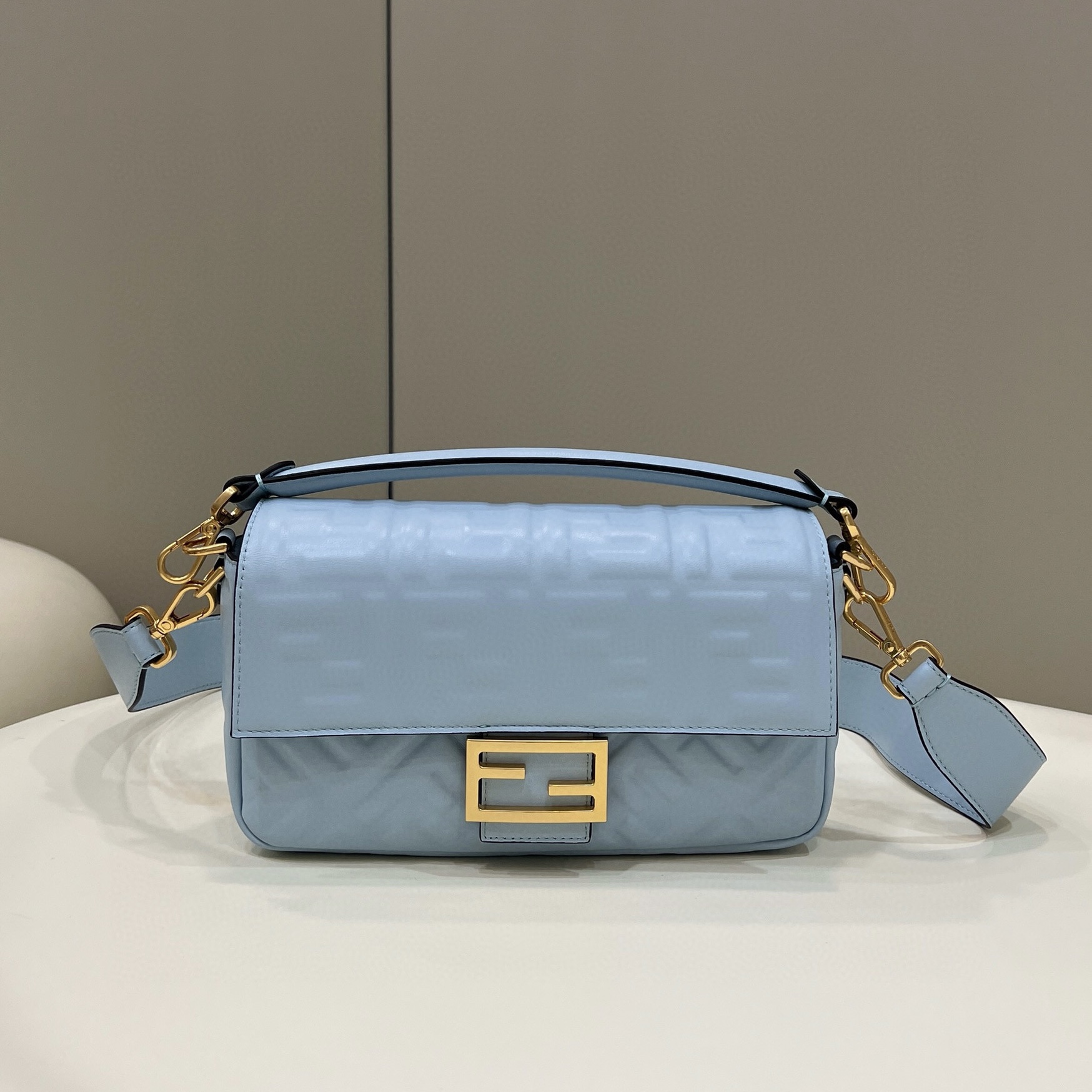 標誌性棕色FF提花圖案布料材質,於腋下背攜時可看見底部的復古金色飾面金屬FENDI字樣。