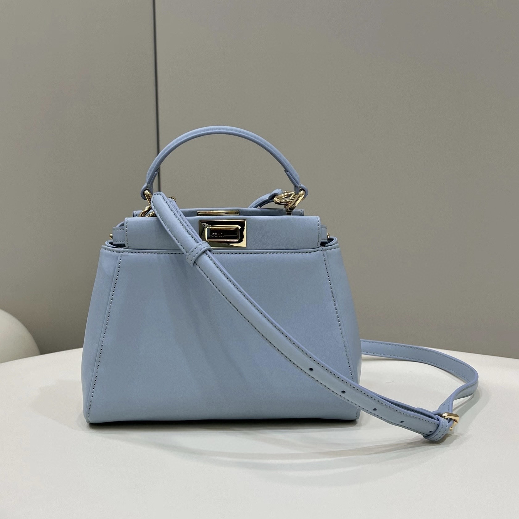 標誌性Peekaboo小號手袋,皮革材質,兩側飾有經典扭鎖。采用飾有標誌性FF浮凸圖案刺繡的帆布內襯,兩個隔層由硬質隔板隔開,配有內部拉鏈袋和金色飾面金屬件。手袋配有手柄和可調節、可拆卸式肩帶,可手提、肩背或斜挎。意大利製造