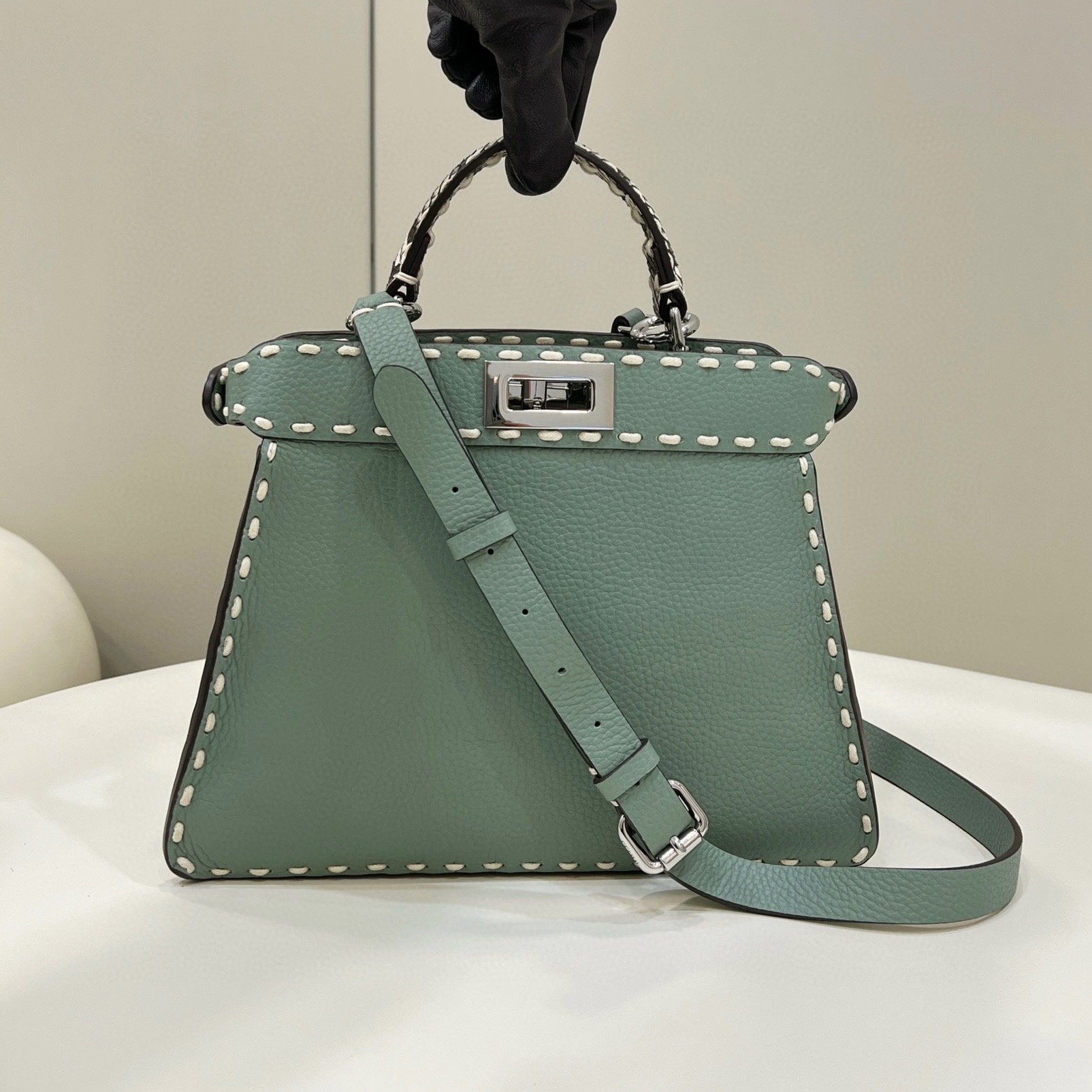 標誌性Peekaboo ISeeU中號手袋,以646針同色系大號明線手工縫製而成,代表著傳統的Selleria工藝。甄選淺藍色Cuoio Romano皮革,帶標誌性天然粒面的小牛皮,經不使用任何金屬的鞣製工藝製成。內裏帶有小牛皮內襯,以Cuoio Romano皮革硬質隔斷分成兩個外露內隔層,配一個可拆式定製內袋。Selleria銀質標牌,銀色飾面金屬件。兩側飾有標誌性扭鎖。配有手柄和可調節、可拆卸式肩帶,可手提或肩挎。意大利製造