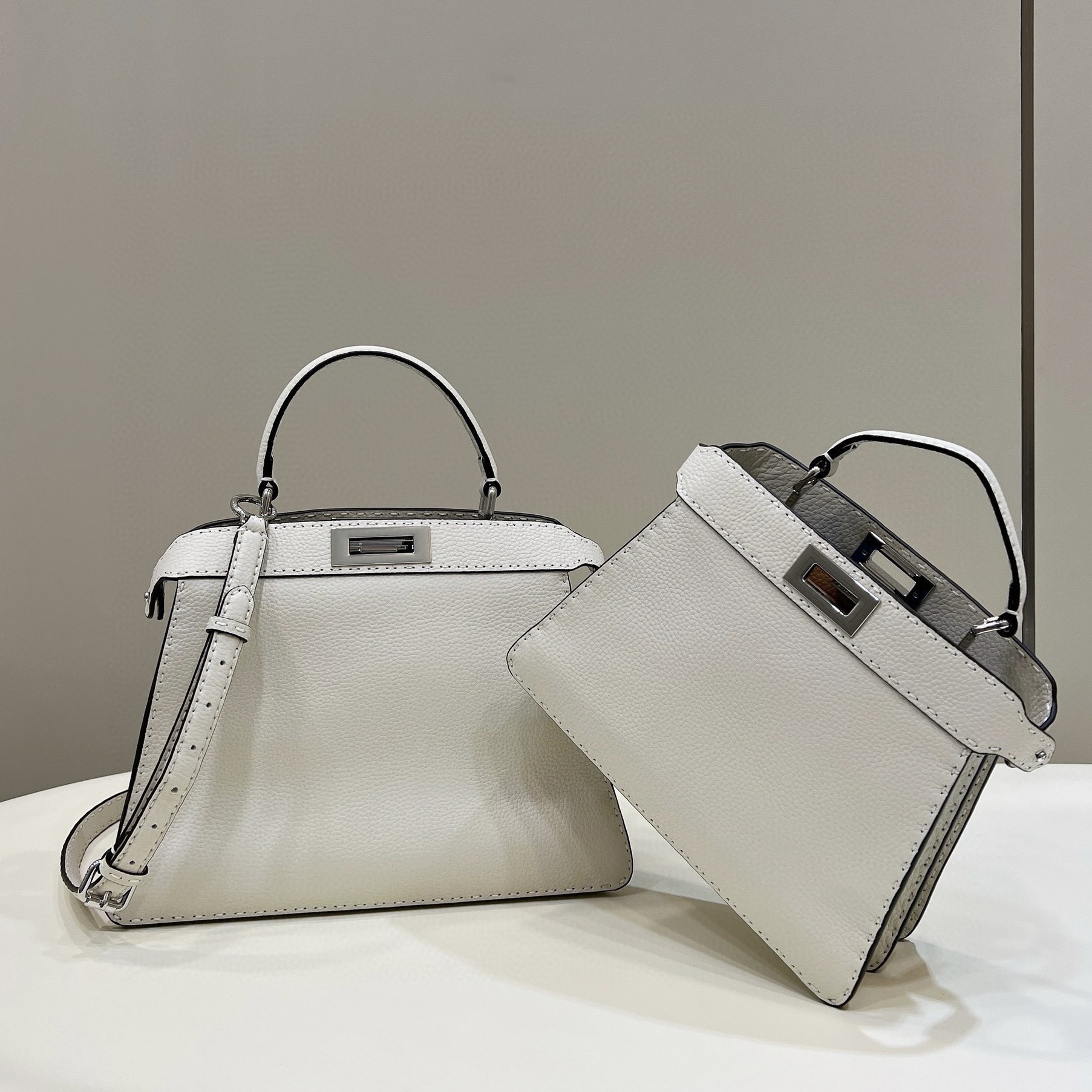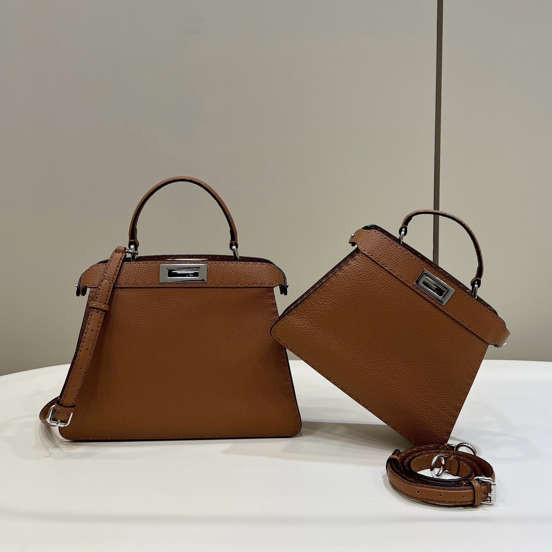 突顯FENDI非凡工藝和創意元素的標誌性Peekaboo ISeeU小號手袋。於2009年推出的Peekaboo手袋是經典手袋的標誌。此名稱靈感源自兒童遊戲「躲貓貓(Peek-a-boo)」,突顯手袋裏裏外外的美感。 小牛皮材質。小牛皮內襯,兩個隔層由鴿灰色和黑色雙色柔軟納帕皮革硬質隔板隔開,配有內部拉鏈袋。飾有玳瑁殼有機玻璃飾條、搭扣和金色飾面金屬件。 兩側飾有標誌性扭鎖。 手袋配有手柄和可調節、可拆卸式肩帶,可手提、肩背或斜挎。 意大利製造
