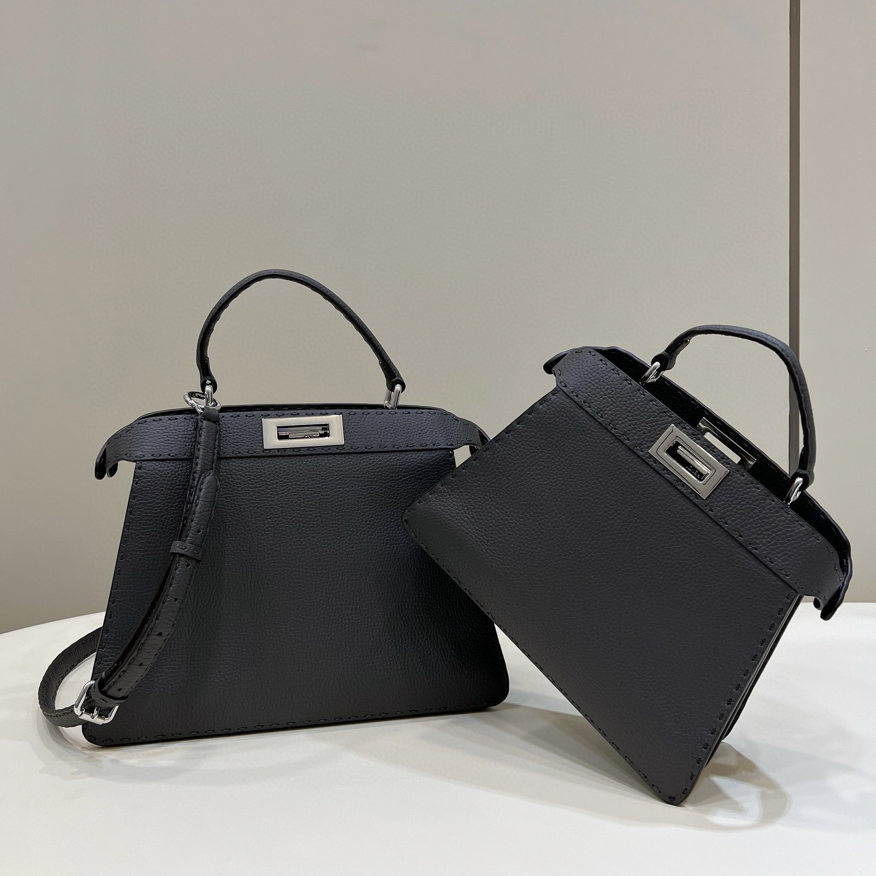 突顯FENDI非凡工藝和創意元素的標誌性Peekaboo ISeeU小號手袋。於2009年推出的Peekaboo手袋是經典手袋的標誌。此名稱靈感源自兒童遊戲「躲貓貓(Peek-a-boo)」,突顯手袋裏裏外外的美感。 鴿灰色小牛皮材質。小牛皮內襯,兩個隔層由鴿灰色和黑色雙色柔軟納帕皮革硬質隔板隔開,配有內部拉鏈袋。飾有玳瑁殼有機玻璃飾條、搭扣和金色飾面金屬件。 兩側飾有標誌性扭鎖。 手袋配有手柄和可調節、可拆卸式肩帶,可手提、肩背或斜挎。 意大利製造