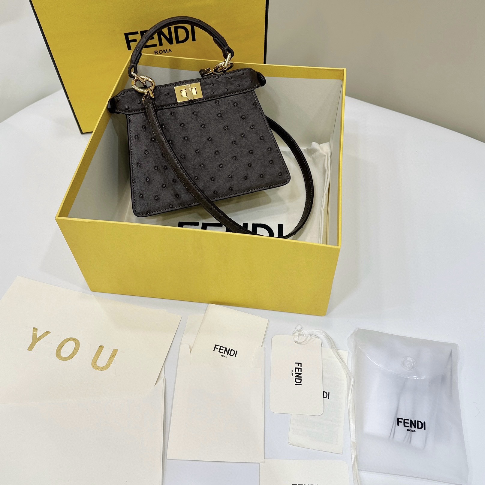 標誌性Peekaboo ISeeU手袋,小巧可人。精致的鴕鳥皮材質,兩側飾有經典扭鎖。柔軟的同色系納帕皮革襯裏,兩個隔層由硬質隔板隔開,配有內部口袋和金色金屬件。配有手柄和可調節、可拆卸式肩帶,可手提或斜挎。意大利製造