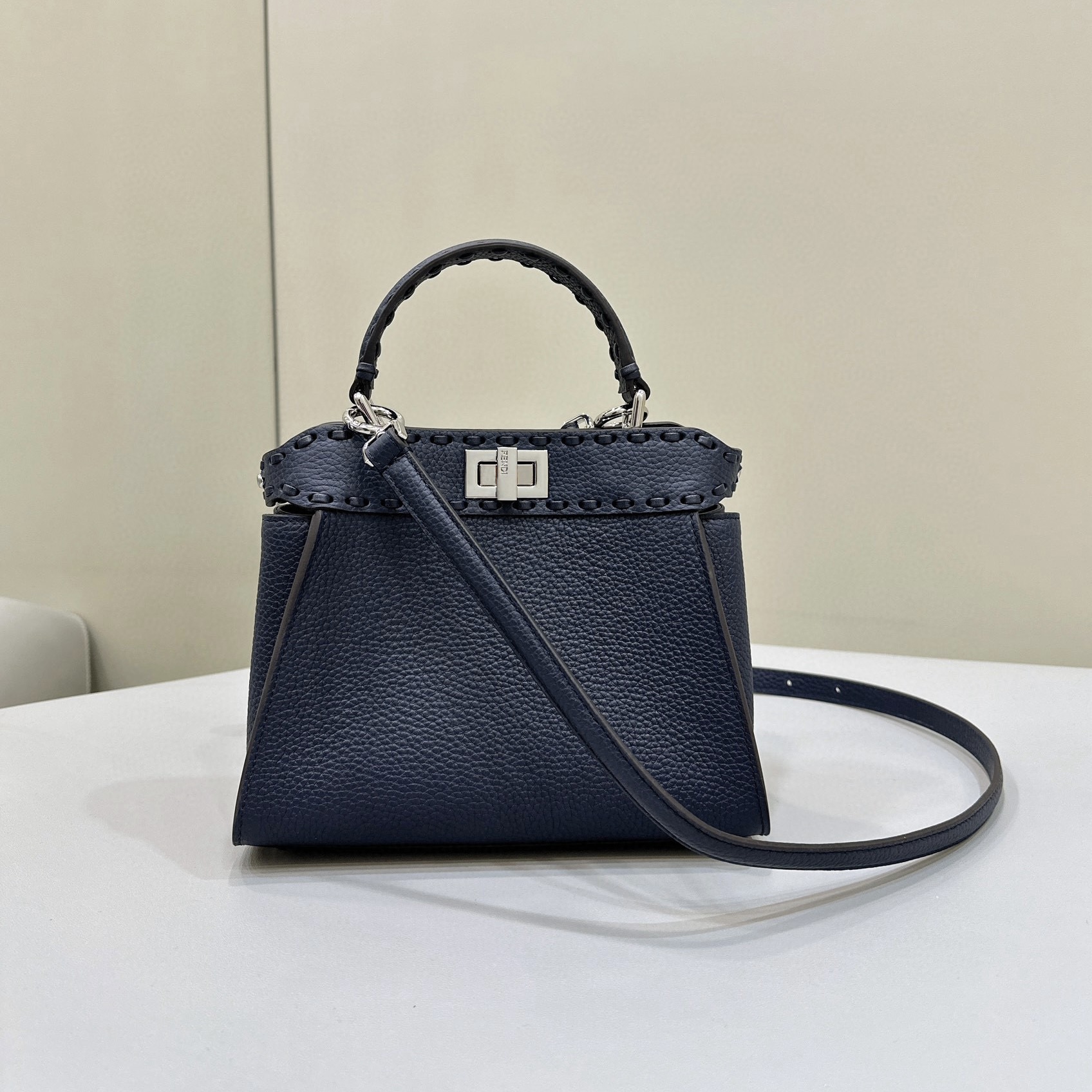 突顯FENDI非凡工藝和創意元素的標誌性Peekaboo ISeeU小號手袋。於2009年推出的Peekaboo手袋是經典手袋的標誌。此名稱靈感源自兒童遊戲「躲貓貓(Peek-a-boo)」,突顯手袋裏裏外外的美感。 小牛皮材質。小牛皮內襯,兩個隔層由鴿灰色和黑色雙色柔軟納帕皮革硬質隔板隔開,配有內部拉鏈袋。飾有玳瑁殼有機玻璃飾條、搭扣和金色飾面金屬件。 兩側飾有標誌性扭鎖。 手袋配有手柄和可調節、可拆卸式肩帶,可手提、肩背或斜挎。 意大利製造