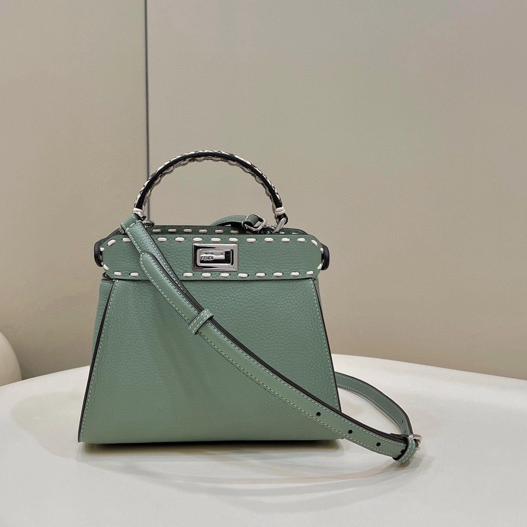 標誌性Peekaboo小號手袋,以220針同色系大號明線手工縫製而成,代表著源自1925年、由FENDI工匠世代傳承的Selleria經典工藝。甄選白色Cuoio Romano皮革和帶標誌性天然粒面的小牛皮,經不使用任何金屬的鞣製工藝製成。內裏帶有小牛皮內襯,以Cuoio Romano皮革硬質隔斷分成兩個外露內隔層,配有一個內袋。Selleria銀質標牌,銀色飾面金屬件。兩側飾有標誌性扭鎖。手袋配有手柄和可調節、可拆卸式肩帶,可手提、肩背或斜挎。意大利製