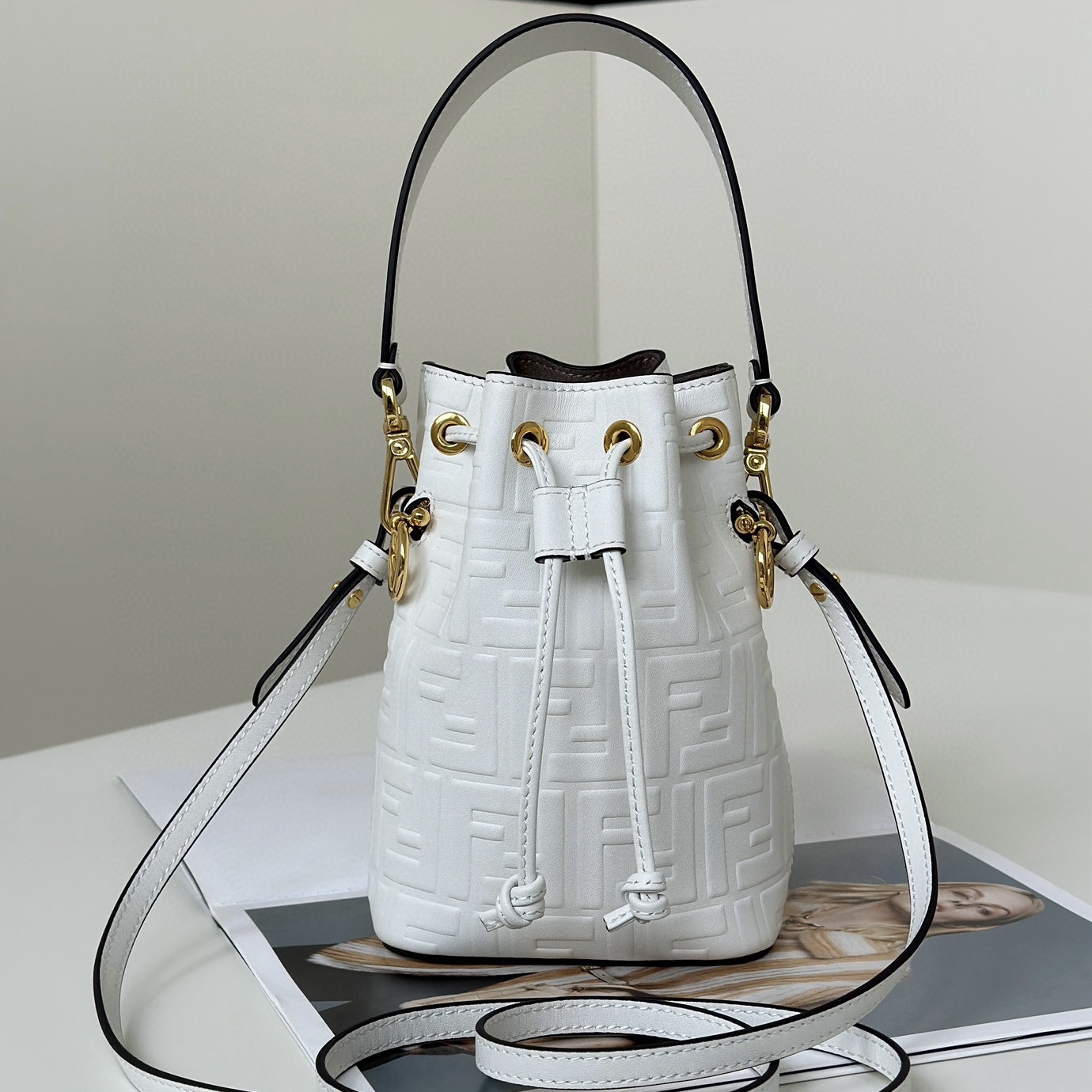 標誌性小號Mon Tresor水桶包,全新比例,方便攜帶隨身物品。皮革材質,立體斜對角FF圖案。