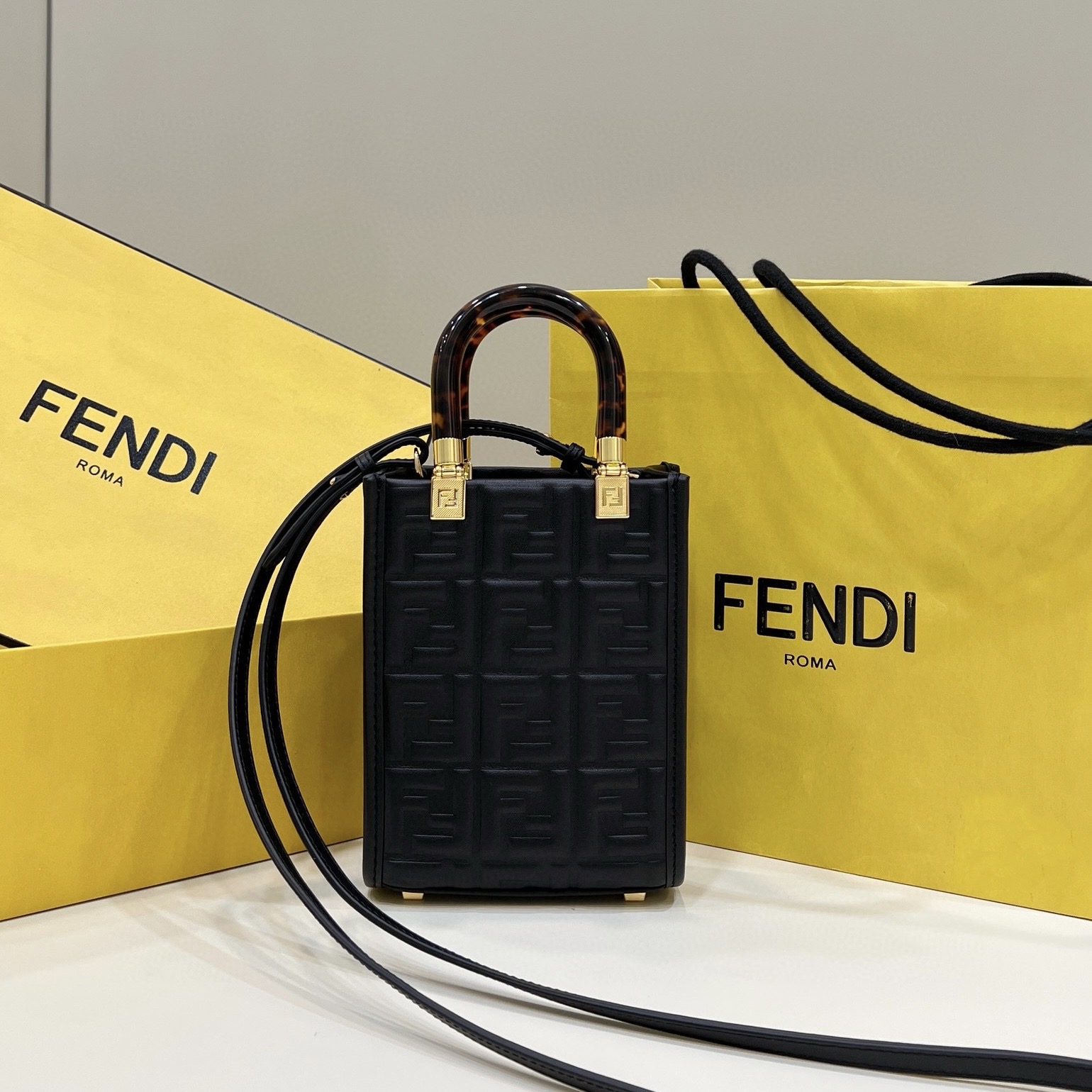 Sunshine迷你手提袋,3D紋理FF圖案的黑色皮革材質,采用玳瑁殼效果硬質樹脂玻璃手柄。配備帶襯裏內部隔層,點綴同色系皮革飾邊和金色飾面金屬件。采用兩個提手和可調節可拆式細肩帶,既可手提,又可肩挎。意大利製造