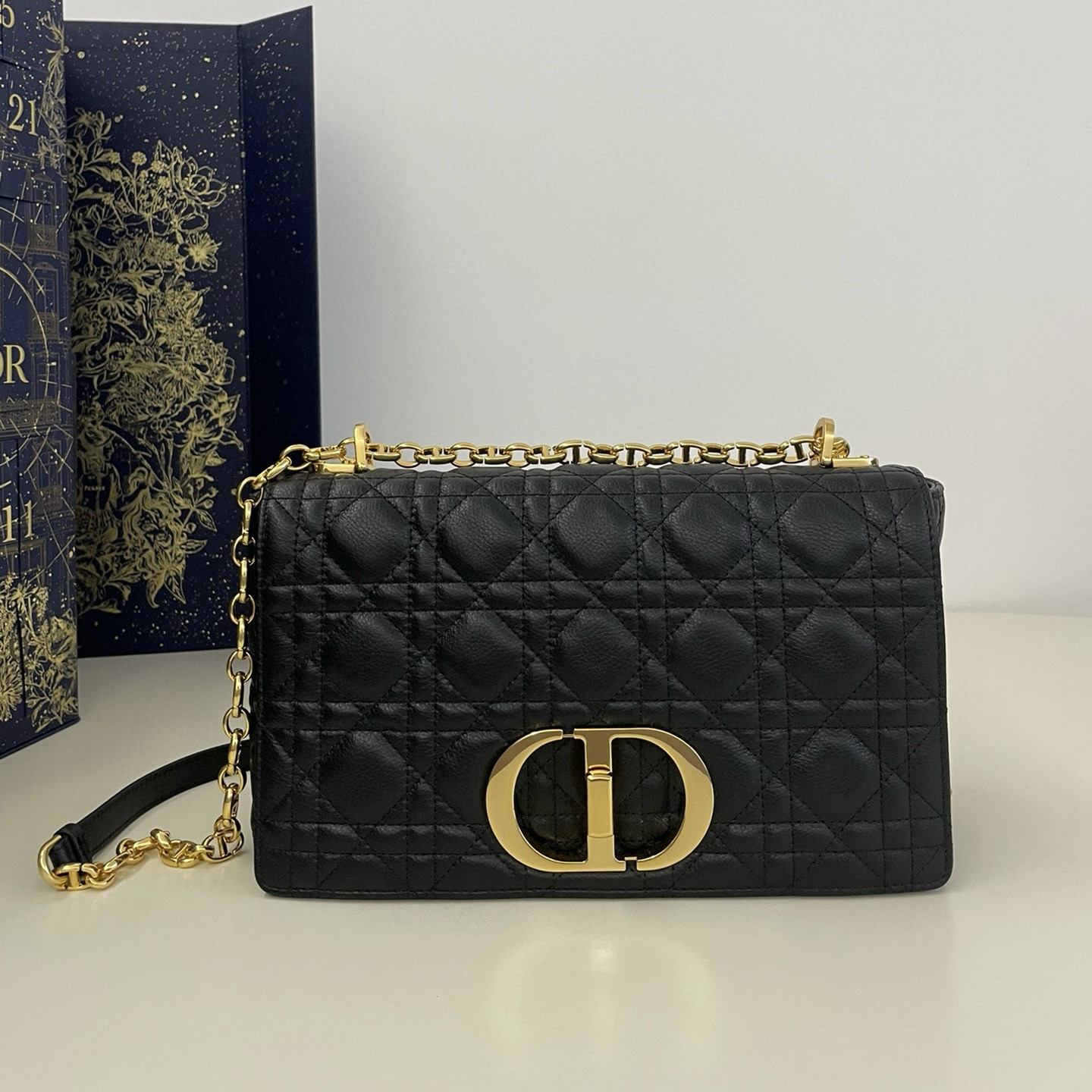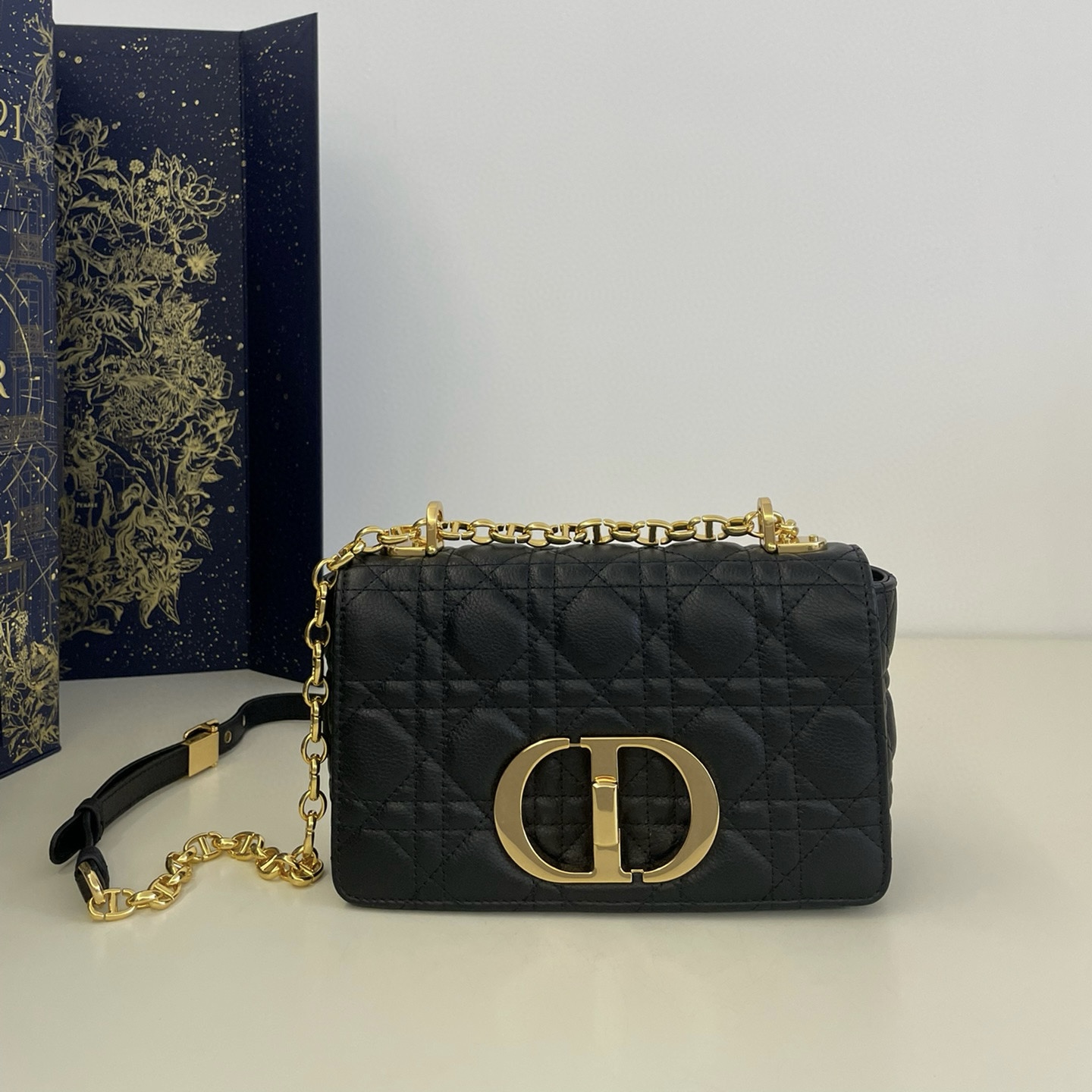 這款 Dior Caro 手袋結合典雅氣質與現代風範。采用黑色柔軟牛皮革等材質精心製作,飾以藤格紋緝面線。翻蓋飾以復古金色飾面金屬旋鈕式 CD 扣環,靈感源自 Christian Dior 香水瓶的封口。中號款式,搭配可拆卸的 CD 標誌鏈環肩帶,可手提、肩背或斜挎,亦可替換成 Dior 刺繡寬肩帶,點綴日常造型或為晚裝亮麗點睛。