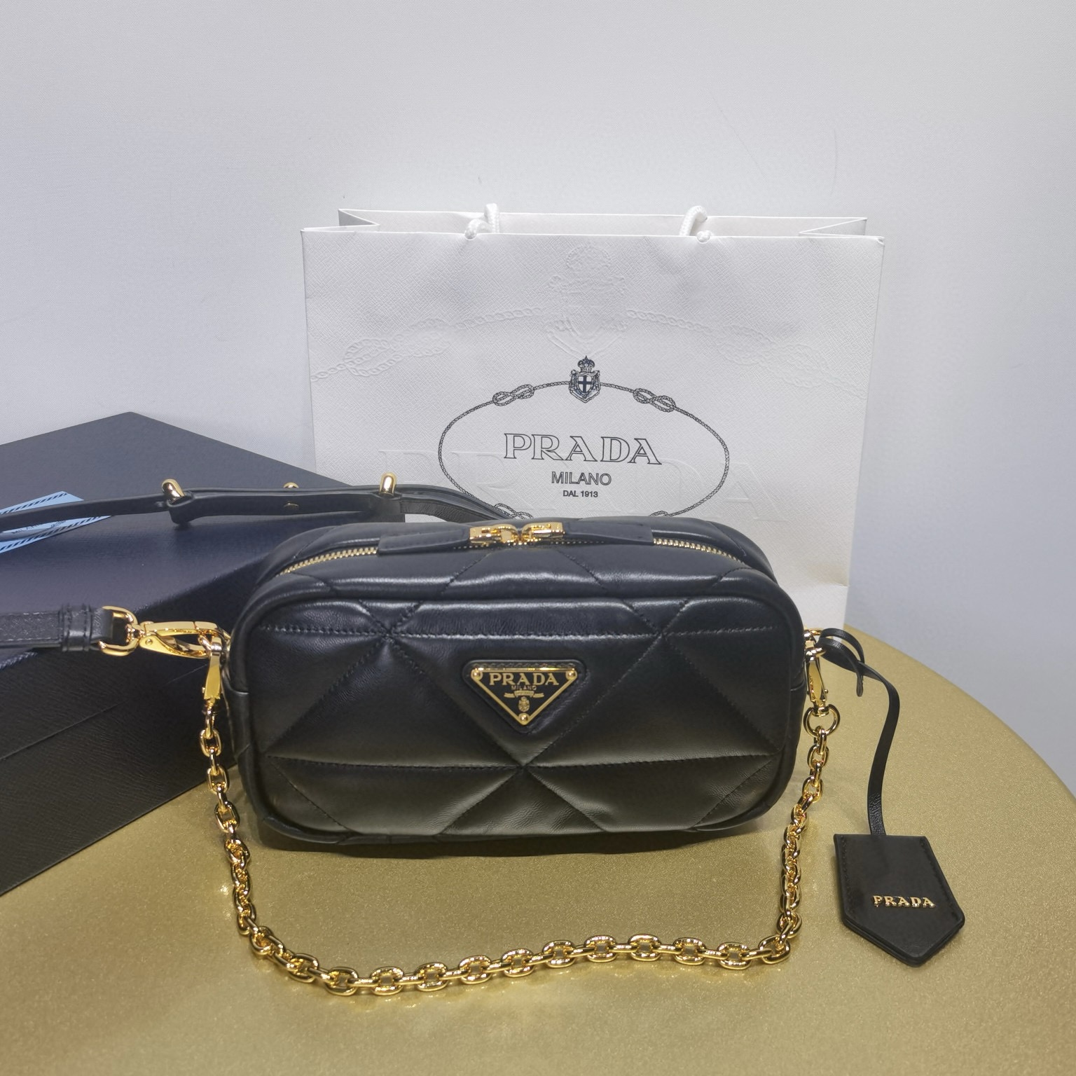 進口羊皮✌手感超好背起來很舒適 輕盈。容量大.間面線絎縫別致的立體三角形圖案重釋標誌性的Prada幾何形狀,飾於此款軟羊皮手袋。刻字徽標裝飾於正面,軟羊皮與徽標織物襯裏,金色金屬件