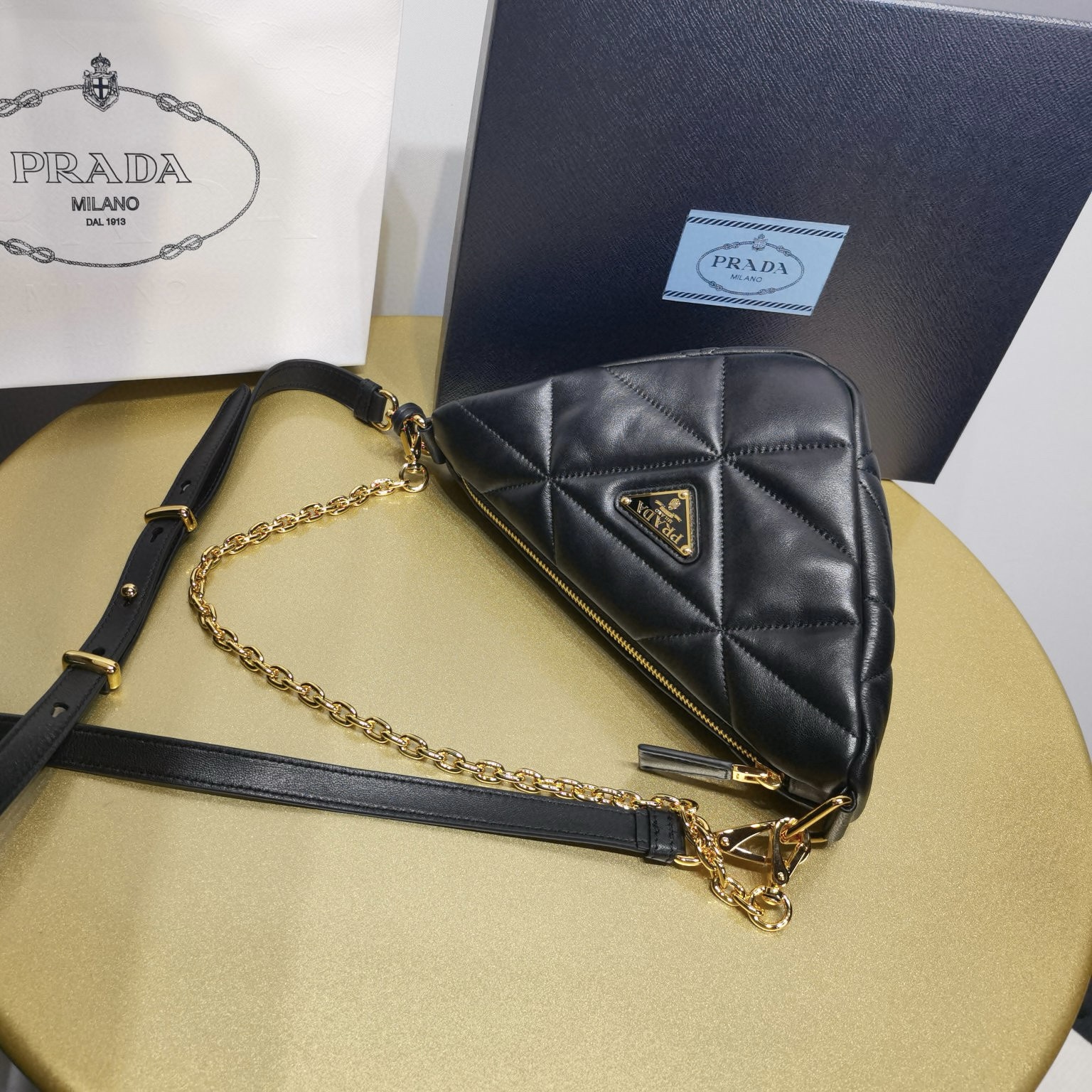 配有可拆卸鏈條肩帶和羊皮肩帶。拆下肩帶也可當手包用,超贊進口羊皮手感超好背起來很舒適 輕盈。容量大.間面線絎縫別致的立體三角形圖案重釋標誌性的Prada幾何形狀,飾於此款軟羊皮手袋。徽標織物襯裏,金色金屬件