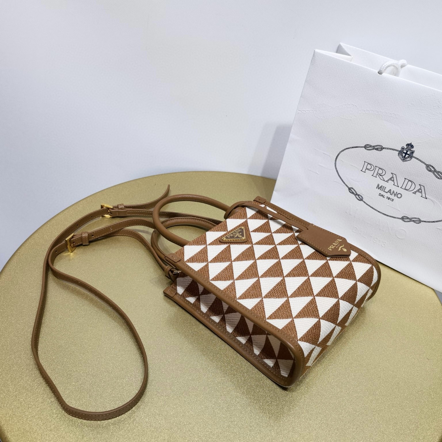 Size:寬28x高22x底9cm Prada三角形藉由簡約廓形彰顯自身的特立獨行和現代風範。此三角形標識由Mario Prada設計而來,初次亮相於品牌的旅行箱,此後每季皆以不同的方式重釋。此處,其幾何設計化身為精美的現代主義圖案,玩轉撞色效果,裝飾於此款廓形簡約的托特包。配有可拆卸的肩帶,便於多種方式背攜。標誌性Saffiano皮細節裝飾其上,平添設計格調