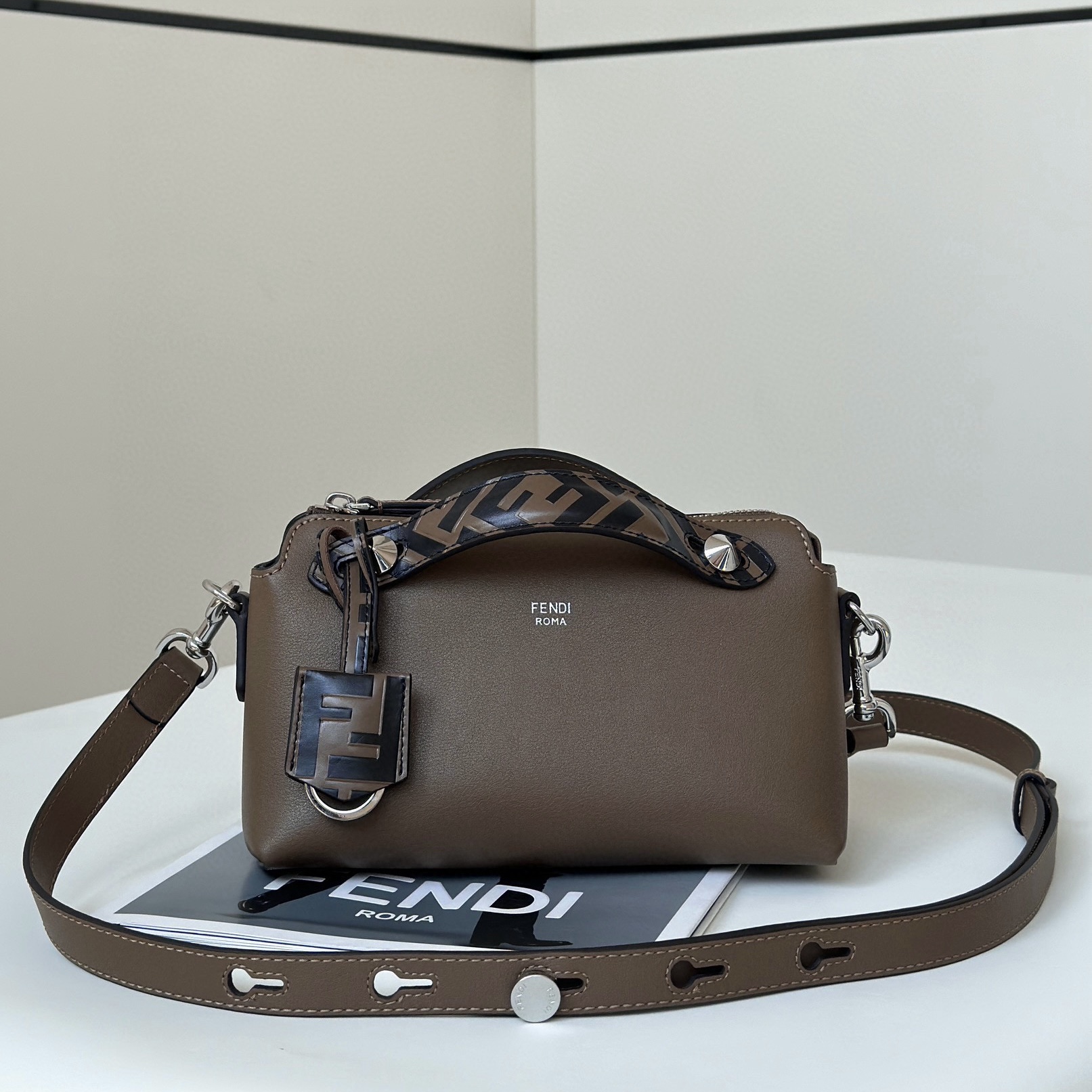 FENDI女士新款包包By The Way Soft迷你手袋 棕色FF提花斜挎包