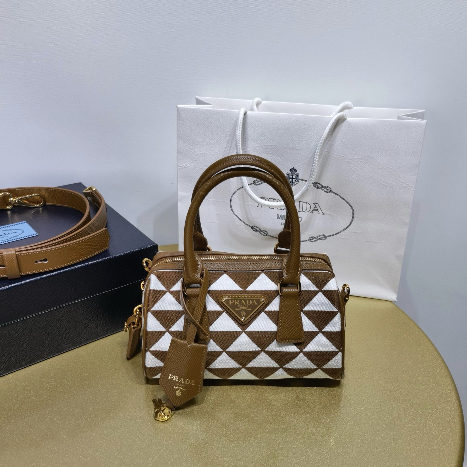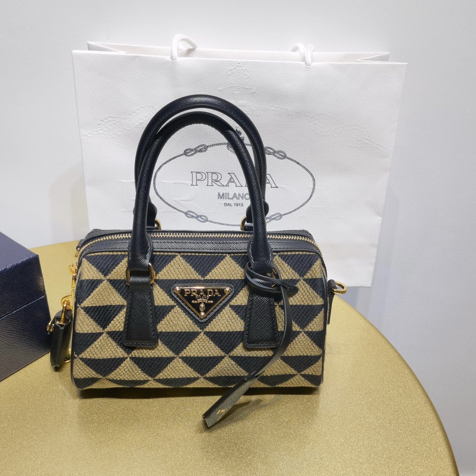 Prada普拉達官網品牌正品專賣店 新款刺繡織物小手提袋波士頓包