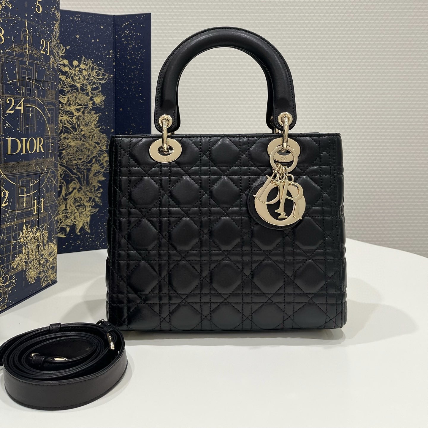 迪奧包包 網站價格圖片 Lady Dior 黑金五格 藤格紋黑色小羊皮